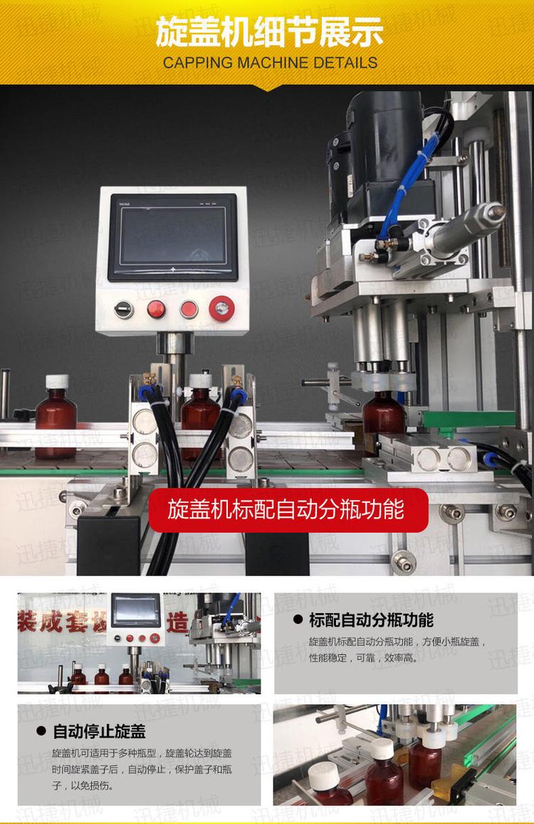 旋蓋優(yōu)勢有:旋蓋機擁有做到自動分瓶功能,當(dāng)瓶蓋旋緊時可自動停止旋蓋,保護了蓋子和瓶子免受損傷。塑料瓶消毒水灌裝機(小玻璃瓶溶液灌裝機)整機由304不銹鋼材質(zhì)組成,灌裝效率和精度高,雙重保證您的物料的包裝效果。