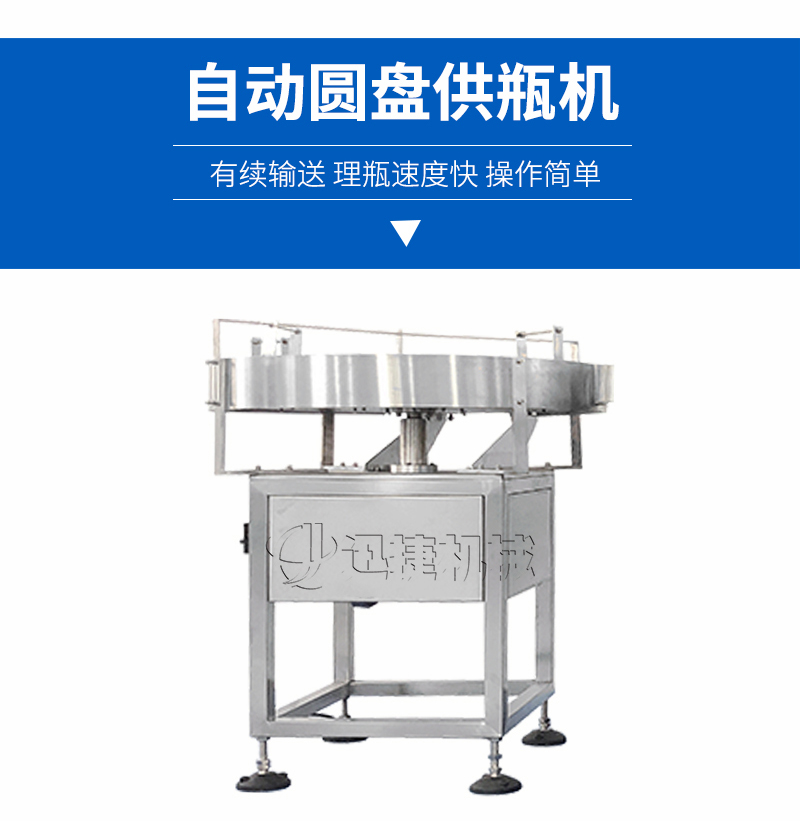 該圓盤供瓶機(jī)理瓶機(jī)是由人工將瓶子放入圓形轉(zhuǎn)盤上,轉(zhuǎn)盤轉(zhuǎn)動(dòng)將瓶子有續(xù)撥入輸送帶,進(jìn)入灌裝機(jī)進(jìn)行灌裝。使用方便,噪音小,理瓶速度快,操作簡單是不可缺少的一個(gè)環(huán)節(jié)。