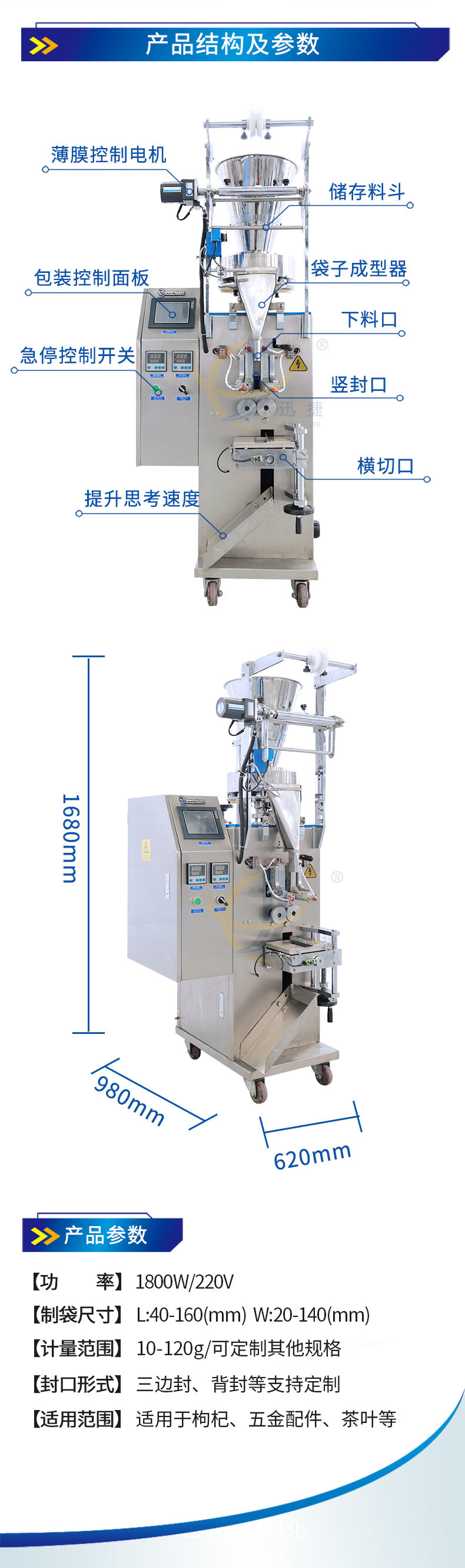 全自動立式顆粒包裝機適用適合食品、化工產(chǎn)品中的圓狀和球狀物料的自動包裝主。枸杞、五金配件、茶葉等包裝。