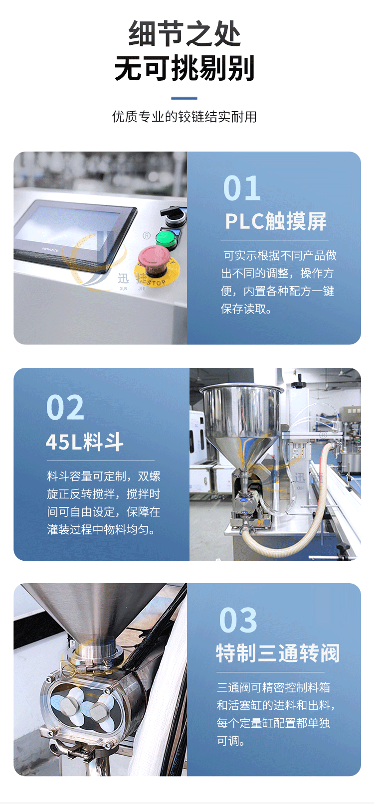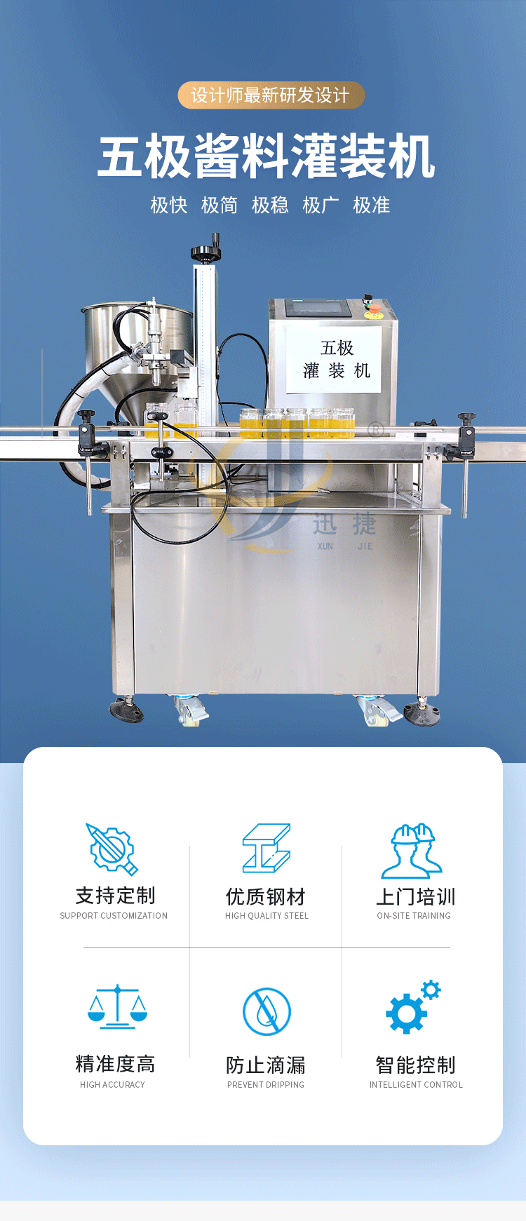五極灌裝機:極快-單頭2200瓶/時 極簡-操作簡單 極廣-啥啥都能灌 極穩(wěn)-24小時不停機 極準(zhǔn)-200g誤差小于1g。它可以和真空旋蓋機搭配使用。