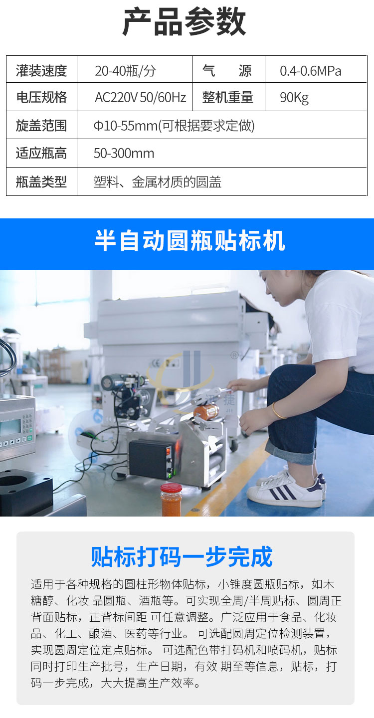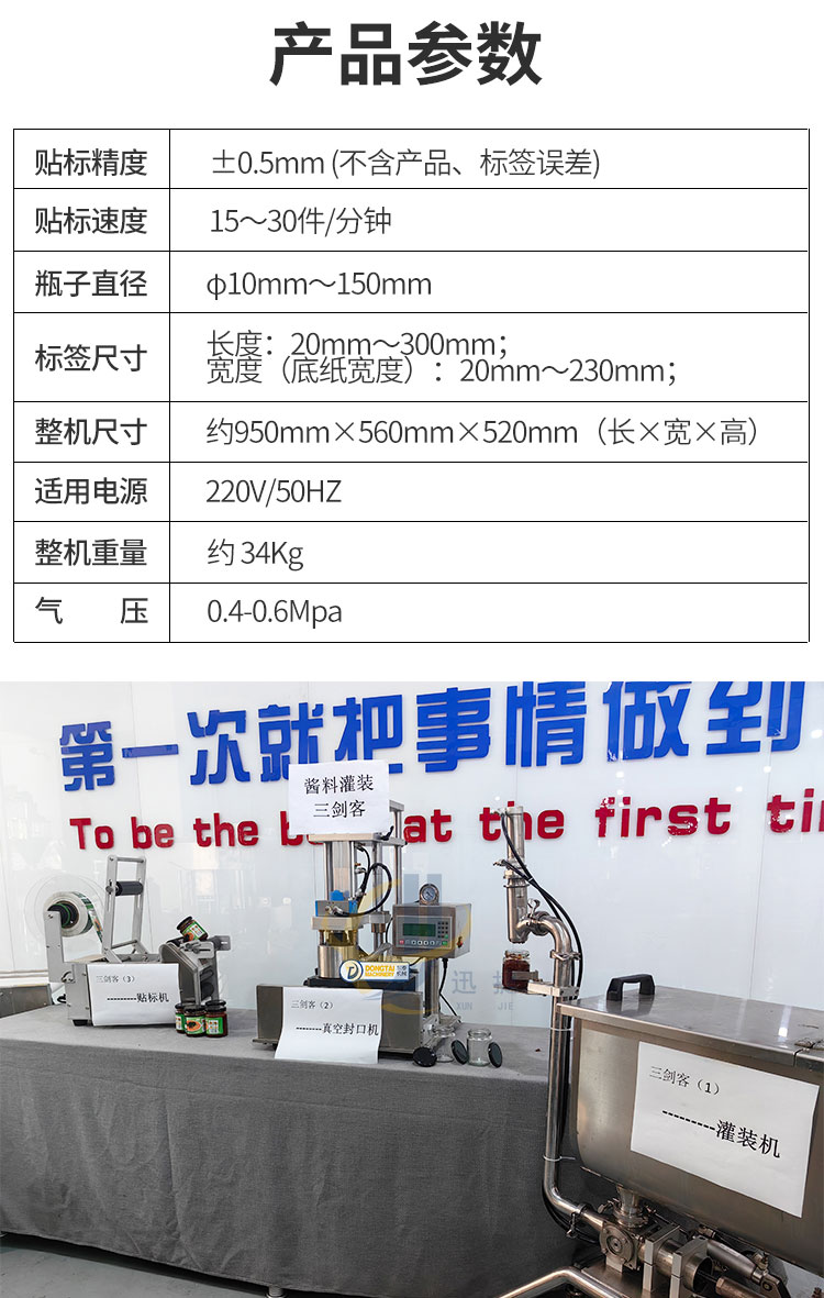小型醬料灌裝生產(chǎn)線又名醬料灌裝三劍客,由半自動醬料灌裝機+半自動真空旋蓋機+半自動圓瓶貼標機組合而成。