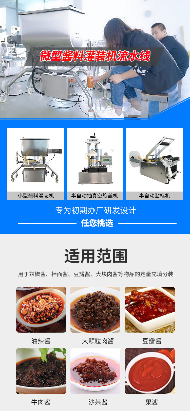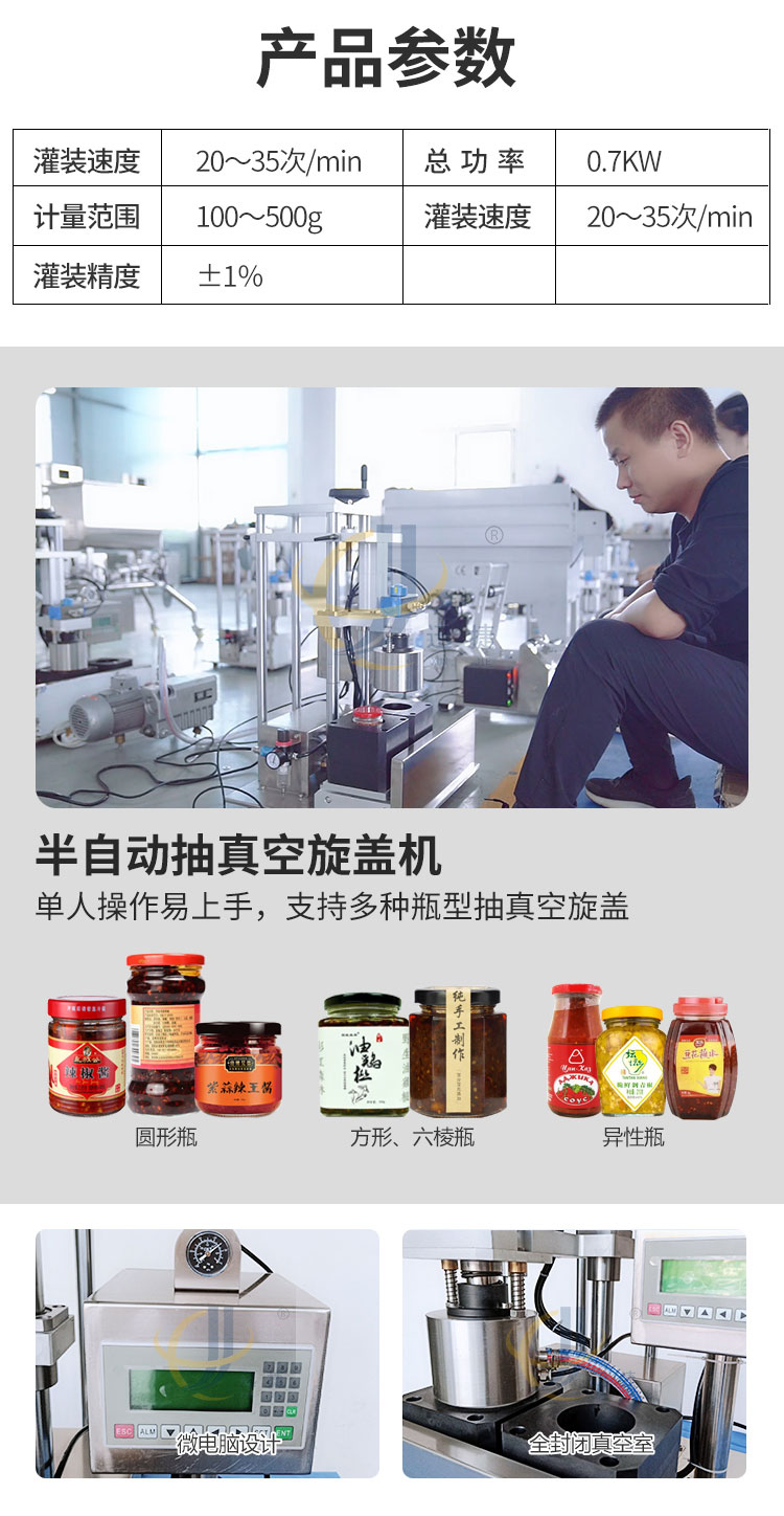 小型醬料灌裝生產(chǎn)線又名醬料灌裝三劍客,由半自動醬料灌裝機+半自動真空旋蓋機+半自動圓瓶貼標機組合而成。該灌裝機適用于辣椒醬、豆瓣醬、大塊肉醬等物品的定量充填分裝。