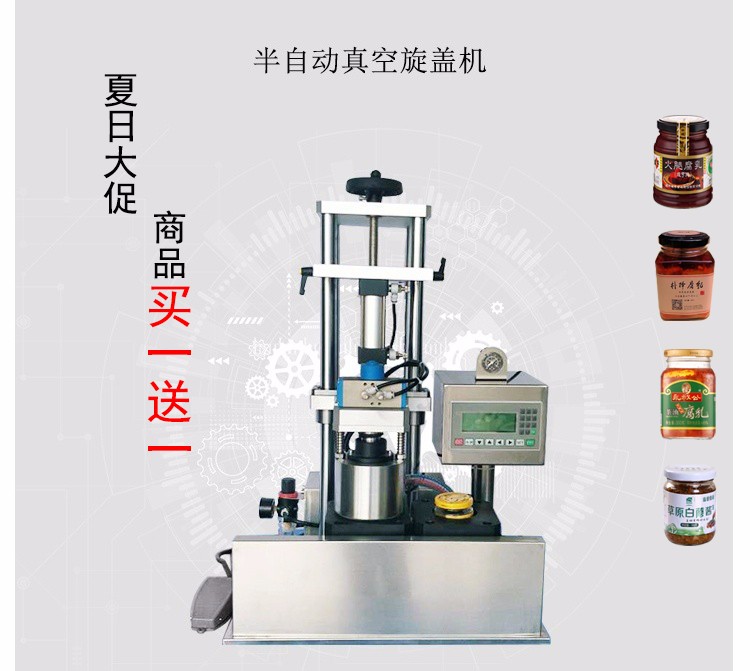 這款小型辣椒醬封口機(jī)主要用于食品包裝,采用標(biāo)準(zhǔn)馬口鐵爪式旋開蓋封口的玻璃瓶包裝。可實(shí)現(xiàn)的功能是抽吸包裝容器內(nèi)的空氣使其達(dá)到設(shè)定的負(fù)壓值(即抽真空),然后旋緊蓋子。 為半自動(dòng)機(jī)型,即人工進(jìn)出瓶,人工配蓋,其他過程自動(dòng)。