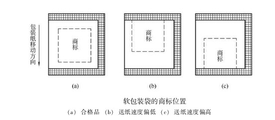 在包裝作業(yè)過程中,卷筒半徑逐漸減小,包裝紙所受張力發(fā)生變化,送紙輥與包裝紙之間的摩擦因數(shù)受環(huán)境溫濕度的影響而發(fā)生波動(dòng),加上商標(biāo)印刷誤差,以及送紙、縱封、橫封、切斷各部分速度的差異等因素,使得刀輥的實(shí)際切線偏離規(guī)定部位。即使這種位置誤差很小,例如在某—包裝袋上只偏差0.1mm,但包裝機(jī)速度很快,有的高達(dá)200包/min, 如不加以控制調(diào)節(jié),機(jī)器運(yùn)行1垃i六 后,誤差積累可達(dá)20mm,切線嚴(yán)重偏離規(guī)定部位,降低了包裝質(zhì)量,甚至造成廢品。如圖所示,圖(a)為合格品; 圖 (b) 為送紙速度偏低,商標(biāo)后移; 圖 (c) 為送紙速度偏高, 商標(biāo)前移。 為了保證包裝袋的正確封切, 必須在卷筒紙供送系統(tǒng)中, 引人商標(biāo)圖案自動(dòng)位置檢測(cè)與控制系統(tǒng)。目前應(yīng)用廣泛的是光電自動(dòng)定位系統(tǒng)。