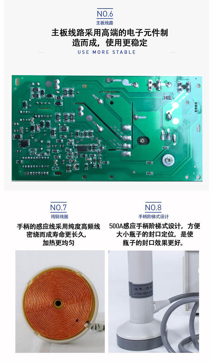 本機(jī)采用國外先進(jìn)線路,選用日本新模塊化功率器件,較于一般電子感應(yīng)加熱器更省電,熱效率達(dá)到90%以上,瞬時加熱速度為后者的20-30倍,因此不僅 適用于熱封性能較好的聚乙烯、聚丙烯材質(zhì)的瓶體,而且對熱封性能較差的聚酯瓶、玻璃瓶也有極好的封口效果。